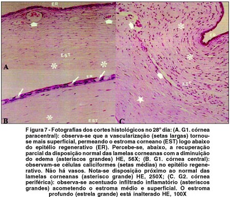A vascularização corneana progrediu algo mais; sem atingir, no entanto, a região central da córnea na T1, sendo percebida na maior parte dos cortes histológicos (quadrantes), atingindo o centro da córnea na T2 e T3. Com a redução do edema, tornou-se mais superficial, localizando-se apenas no terço superficial.