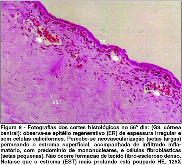 Nas três técnicas, a resposta fibroblástica reparativa e a proliferação vascular permearam no terço estromal superficial, sem, contudo, haver evidência histológica da formação de tecido fibro-escleroso denso ou cicatriz propriamente dita (Fig. 8).