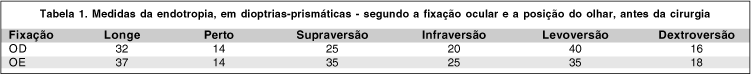 A medida do desvio pelo teste de cobertura alternada e prismas revelou endotropia incomitante (tabela 1). Um desvio vertical, pequeno (D/E 4 D) foi notado, apenas, na fixação do olho direito em supraversão; por seu isolamento e baixo valor, pode ser julgado sem importância clínica.