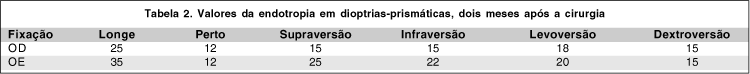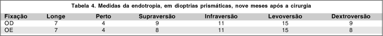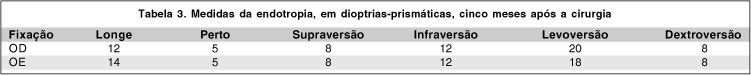 Num exame cinco meses após a cirurgia, valores ainda menores da endotropia foram achados (embora ela ainda se mantivesse praticamente inalterada em levoversão). Um pequeno desvio vertical (D/E 5D) foi notado em levoversão, tanto na fixação do olho direito como na do olho esquerdo (tabela 3)