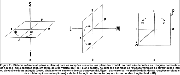 Movimentos oculares são definidos como sendo de translação ou de rotação, com respeito a um conjunto referencial de eixos e planos externos ao olho e dele próprio(2-3).