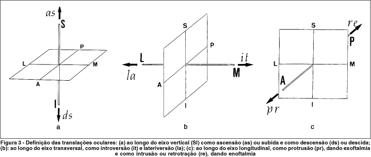 c) Ao longo do eixo longitudinal, extrusão, ou protrusão (pr), ou avanço (quando o olho se anterioriza na órbita) e intrusão, ou retrotração (re), ou retrocesso (quando o olho é deslocado para trás, na órbita (figura 3c). A protrusão causa a exoftalmia e a intrusão a enoftalmia.