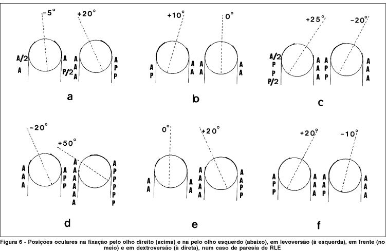 A figura 5 ilustra, esquematicamente, o comportamento inervacional dos pares de músculos horizontais (RME e RLE para o olho esquerdo, RMD e RLD para o direito), conforme tonicidades musculares (representadas pela letra A) e forças passivas de estruturas perioculares (representadas pela letra P), sempre equilibradas (A e P são tomadas, simplificadamente, como equivalentes) em cada uma das posições oculares de levo ou dextroversão.