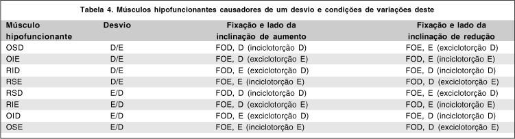 Note-se que para um músculo (e.g., o OSD) a função maximamente suscitada (inciclotorção OD na inclinação para a D, na FOD, para que ocorra o maior desvio) contrapõe-se à ação oposta (exciclotorção OD e inciclotorção OE) em que ocorre o menor desvio (na inclinação para a E, na FOE), justamente aquela em que aparece o maior desvio quando o músculo hipofuncionante é o RSE. Nesse caso, portanto, as oposições se dão entre o OS de um lado e o RS contralateral, entre o RI de um lado e o OI contralateral(17-18).
