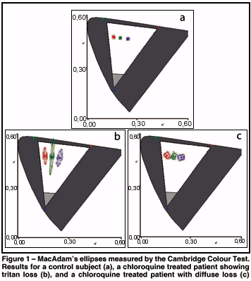 The present results support the recommendation made by other authors to monitor visual function during treatment with chloroquine. Among the tests used here, the CCT is the most highly recommended for both diagnosis and follow up because it is sensitive, uses a very rigorous psychophysical procedure and provides quantitative data that can be directly interpreted in CIE colour space, while the FM100 is a test that is influenced by training and by other subjective factors.