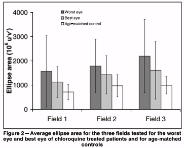 We studied patients that make use of chloroquine for the treament of rheumatic diseases but, at the same time, had no ophthalmoscopic signs of retinopathy. Patients were referred by rheumatologists in both centers. All patients were submitted to an ophthalmological examination that included evaluation of corrected visual acuity, biomicroscopy, tonometry and indirect ophthalmoscopy. Patients with any finding that would be related to chloroquine retinopathy or other ophthalmological pathology were excluded from the present study. Informed consent was obtained from all subjects, in accordance with the Declaration of Helsinki determinations.
