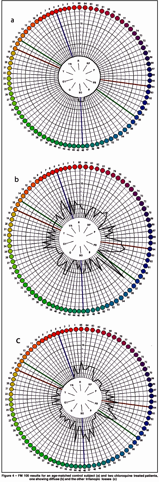Typical results for the FM100 Test are shown in Figure 4 for a control subject and for two chloroquine treated patients, one with diffuse loss, the other with a light tritan loss. The numbers in the periphery of the graph correspond to the Munsell colors that are ordered in the test. The radial plot shows the magnitude of each error that was made when arranging the colours sequentially. Error magnitude indicates the distance between each colour and the next one. A test result with no errors is represented by a radial plot that constitutes a perfect circle. Errors made by subjects with protan, deutan and tritan deficiencies fall along the respective confusion lines.
