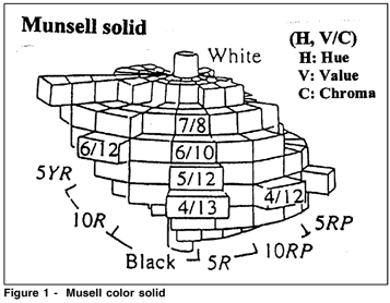 This system was originally defined by A.H.Munsell, an artist and educator in Boston. The first book, A Color Notation, was published in 1905. This is "an exeprimental system built up with the aid of a new photometer, Maxwell disks, and the trained capacity of the painter"(7). The basic principle is to arrange standard color chips according to cylindrical coordinates. This is called Munsell color solid (Fig. 1). The virtical axis in the center represents lightness (called Value V), polar angle and polar distance represent Hue H and saturation (called Chroma C). In each coordinate, adjacent standard chips are supposed to differ perceptually with a constant step. The Optical Society of America (OSA) established in 1937 a committee to examine the color spacing in the Book of Color (1929). The assessment methods used by the committee are described in Newhall(8-10). What we use today is the Renotation Munsell based on the study of this committee(11). Lightness V varies from 0 (ideal black) to 10 (ideal white). The hue circle at a given V is divided into 10 sectors of the same size, 5 principal hues [red (R), yellow (Y), green (G), blue (B) and purple (P)] and 5 intermediate hues such as yellowish red (orange) YR, bluish green BG, etc. Each of these 10 sectors is subdivided into 10 steps, 0 to 10, where 5 is given to the most representative color of the sector. For instance, 5R means pure red and 10R (= 0YR) means the hue at the border between R and YR. Chroma C varies from 0 (gray at V) to a most saturated color of that H at V. How far C extends depends upon H and V. For instance, for 5R at 5V, most books give the chips, 2C, 4C,..., 12C. By comparing a sample to the Munsell solid under a standard illumination, we can assign it a set of values (H, V/C). Often, visual interpolation becomes necessary. In each attribute, standard color chips constitute a series of equal appearing intervals, which is helpful in making interpolation easier. However, no attempt has been made to equate step sizes between different attributes. From experience, color practitioners know that a difference of 1V interval roughly corresponds to a difference of 2C interval.