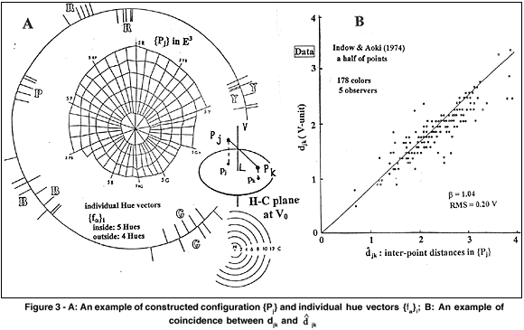 are limited in the range of smaller than 3.5V. The space implied by E3 is a 3-dimensional manifold with locally Euclidean metric. The configuration {Pj} in E3 represents the basic structure of the Munsell solid. Fig. 3A is {Pj} based on two sets of D = (djk), in each djk are mean results of 5 observers. It is known that even if {Pj}i are individually constructed from Di = (djk)i of observers i of normal color vision, these {Pj}i exhibit essentially the same structure(13).