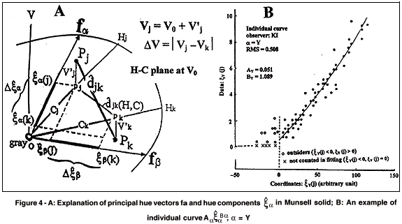 jk with a sufficient accuracy. In so far as supra-threshold differences of medium level are concerned, it is very likely. Furthermore, in the same space, we can have a set of hue vectors {fa} from which we can predict how the color represented by Pj will appear to human eye. This is a comprehensive spatial systematization of human cognition of surface colors. However, it seems to me not likely that the effectiveness of spatial representation can go beyond this level. In Fig. 4A, geometrically we can relate