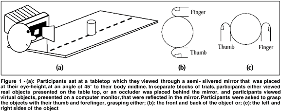 The dependent measure of prehension lends itself naturally to assessing the subject's estimate of an object's size and distance in addition to assessing their estimate of depth which is the main dependent measure of most, but not all, psychophysical studies(16). In the present experiment, subjects were asked to pick up the object either from front-to-back, to provide an estimate of perceived depth, or from side-to-side, to provide an estimate of perceived size/width. The fact that the visual depth cues require an estimate of distance to determine the correct depth, and the use of retinal size requires an estimate of distance to determine physical size allows us to address the important question of whether a common estimate of distance is used in each case(9) and, in turn, whether this is the same as that used to program the transport component of the reach.