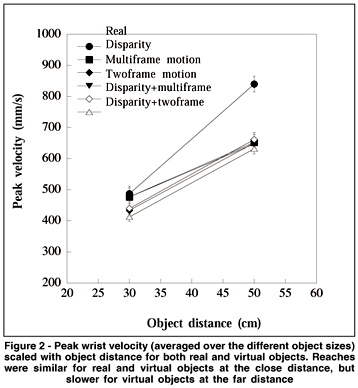 Individual mean values were calculated for each object by distance combination and entered into a 6 x 2 x 3 x 2 [stimulus type x object distance x object size x grasp orientation (width or depth)] analysis of variance. Typical of reaching experiments, the peak velocity of wrist movements was found to increase with increasing object distance (F1,7=66.7; p<0.001). This is illustrated in figure 2 which depicts the average peak velocity attained at each distance and for each experimental condition.