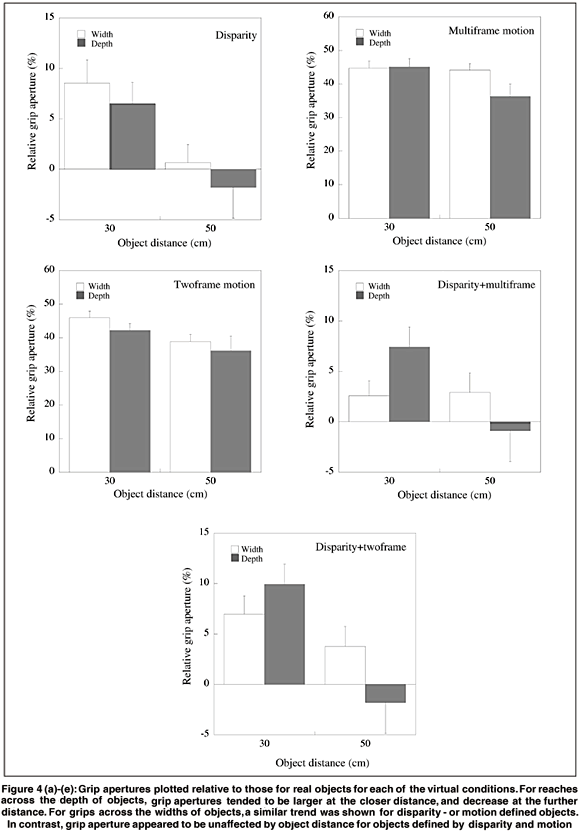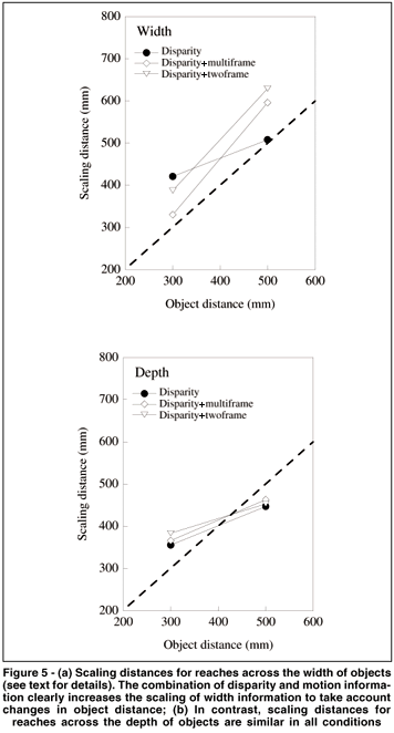 In the estimation of size and depth (i.e. grasping side-to-side, or front-to-back) on the basis of disparity information alone, the results seemed very similar to those previously reported based on standard psychophysical procedures such as the ACC task(4,37) and size and depth settings(3). When disparity and motion cues were available together, in either the twoframe or multiframe condition, there was no discernible advantage for the recovery of depth information. The estimates of width, however, did significantly improve. This suggests that a more reliable estimate of viewing distance is recovered in the combined-cue condition but that it is only used effectively for the estimation of object width. Presumably given that angular size is available directly, the improved performance under the combined cue condition is attributable to a more reliable estimate of viewing distance being available.