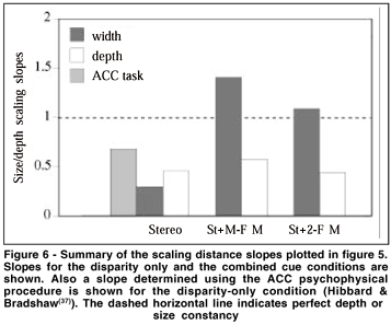 The slopes of these size and depth scaling graphs are informative. The dashed line (slope of 1) depicts perfect depth or size constancy whereas a slope of zero would indicate that object distance was not taken into account when determining perceived size and shape. Clearly the scaling of depth on the basis of binocular disparity information is not affected by the presence of relative motion information. This is true in both the multiframe and twoframe conditions. For width however, the story is somewhat different as the slopes are much greater (and close to 1) in both the combined cue conditions.