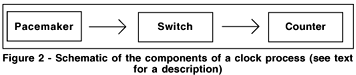 In some parts of the empirical work presented below, the first component, or the clock process of this general framework, is the most interesting aspect. The clock itself is usually described as a pacemaker-counter device (Figure 2). Its functioning is based on the emission of pulses of some sort by a pacemaker, and the number of pulses accumulated by the counter determines the perceived duration of a temporal interval. The pacemaker-counter device is frequently reported to include a switch component that can interrupt the transmission of pulses to the counter. This switch component is often said to be under control of attention(28) (for a review(29)).