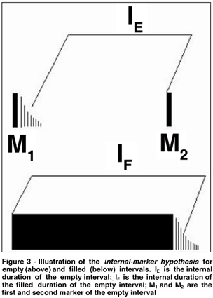 Moreover, for intervals ranging from 250 to 500 ms, temporal discrimination is usually better with empty intervals than with filled ones(36); the difference disappears, however, with longer intervals(39). The filled/empty difference can probably be explained by what has been called an internal-marker hypothesis(36,40). According to this hypothesis, discrimination levels for filled and empty intervals may differ because the timekeeping period in each case is not equal.