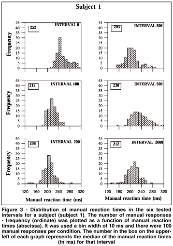 The mechanisms underlying the reduction of SRTs in the gap paradigm are not yet completely understood (for a review(7)). It is also not clear whether the reduction on reaction times observed with visual offset represents a general sensory-motor phenomenon or if they are restricted to the saccadic system. In fact, some authors(17-20) have tried to elicit express manual responses using choice reaction time paradigms. In short, no evidence has been presented for the existence of a sub-population of manual reaction times corresponding to the express responses. These results led us to study the effects of visual offsets on manual responses by changing some of the experimental procedures used by other researchers. In the present study, we employed the simple reaction time paradigm, which, in our view, is best suited to demonstrate "reflex-like" manual responses. We also decided to use a peripheral offset instead of a FP offset (as Mayfrank et al.(15) and Braun and Breitmeyer(16) did) and, to avoid anticipatory errors and/or time-locked manual responses, we used variable intervals between the offset of S1 and the onset of S2. Thus, our experiments differ from most of the previous ones in three important ways: the use of a simple manual reaction times paradigm; the use of a peripheral stimulus offset instead of a fixation point offset; and the use of a variable array of intervals, since most of the studies used a constant interval or a blocked array of intervals (i.e., during a block of trials, the interval was constant - typically 200 ms).