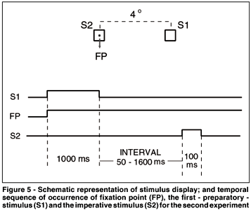 Initially, it is important to comment about the relevance of using a peripheral offset instead of a fixation offset in our experiments. First, it allows a comparison with the studies of Mayfrank et al.(15) and Braun and Breitmeyer(16), which also employed peripheral offsets. As the goal of this study was to compare our MRTs data with their SRTs data, it would be important to have similar procedures. The second reason is that by using peripheral offsets we could present S2 around the FP. This procedure is important to discourage the subjects to make an eye movement during the experiment. Since S2 would be detected more efficiently if their eyes were maintained on the FP the subjects would fare better in the tests if they avoid moving the eyes.