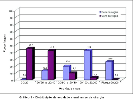 O gráfico 1 mostra a distribuição da acuidade visual com e sem correção antes da cirurgia. Pode-se observar que cerca de 68% dos olhos avaliados possuíam acuidade visual sem correção de 20/100 ou menos. Com o uso da correção mais de 45% atingiram visão 20/20 e outros 41,9% ficaram no intervalo entre 20/25 e 20/40, o que totaliza 87,1% dos casos.