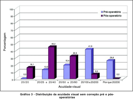 No gráfico 3 observa-se a comparação entre os grupos de acuidade visual sem correção antes e após a cirurgia. Registrou-se cerca de 68% dos casos com visão 20/100 ou pior no pré-operatório e mais de 61% com visão 20/40 ou melhor no pós-operatório.