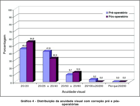 O gráfico 2 mostra a distribuição da acuidade visual com e sem correção após a cirurgia. Após a cirurgia, mais de 60% dos casos apresentaram visão 20/40 ou melhor sem correção. Com a correção, no pós-operatório, a proporção de olhos nesta faixa manteve-se 87,1%, como no pré-operatório, porém com 54,8% com visão 20/20.