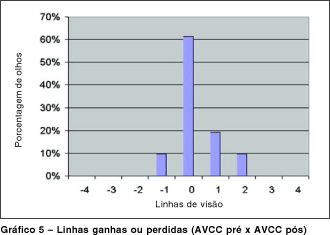 Quando analisamos a proporção de linhas ganhas ou perdidas, pode-se observar que o ganho de linhas da acuidade visual não corrigida foi muito significativo, sendo que em quase 65% dos olhos observou-se um ganho de mais de três linhas de visão e somente 3,2% mantiveram a mesma acuidade visual. Para a visão corrigida, a maioria (61,3%) manteve-se da mesma forma e houve perda de uma linha em aproximadamente 10% dos olhos sem nenhuma causa específica para esta perda. Outros autores(1,8) também encontraram um olho em que ocorreu perda de uma ou mais linhas de visão na acuidade visual pós-operatória com correção, sendo que, neste último a perda de linhas deveu-se à ocorrência de um glaucoma de ângulo fechado secundário.