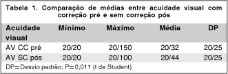 A tabela 1 mostra a comparação entre as acuidades visuais com correção pré-operatórias e sem correção pós-operatórias (p=0,011).