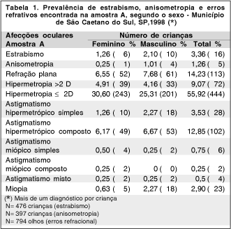 Na tabela 1, mostramos os achados das afecções oculares encontradas na amostra A, considerando cada criança como dois olhos isoladamente (exceto para estrabismo e anisometropia, onde consideramos a criança como única).