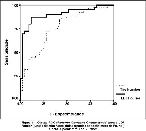 Para uma especificidade de 91%, a sensibilidade foi de 80%. Reduzindo a especificidade para 81%, a sensibilidade foi de 88%. O ponto de corte que resultou em máxima relação sensibilidade / especificidade foi 0,151 (pacientes com valor da LDF Fourier menor que 0,151 classificados como anormais). Para este ponto de corte, a LDF obteve uma sensibilidade de 88% e especificidade também de 88%. O viés estimado para a área sob a curva ROC foi pequeno, de 0,013 (1,44%).
