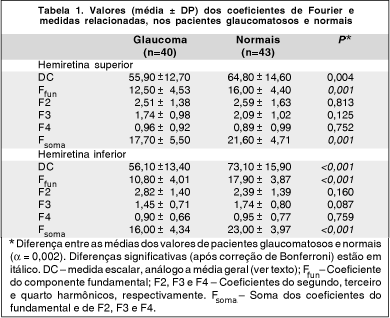 Neste estudo, a análise de Fourier dos valores de espessura da CFN fornecidos pelo GDx foi realizada de maneira similar à anteriormente descrita na literatura(33). Várias medidas foram obtidas a partir dos coeficientes de Fourier fornecidos: Ffun (coeficiente do componente fundamental), Fsoma (somatório dos coeficientes do fundamental, segundo, terceiro e quarto harmônicos), Fassimfun (quociente entre o Ffun superior e o Ffun inferior, representando a assimetria existente entre as duas hemiretinas no componente fundamental) e Fassimsoma (quociente entre o Fsoma superior e o Fsoma inferior, representando a assimetria do somatório de todos os coeficientes entre as duas hemiretinas). As várias medidas dos coeficientes de Fourier foram combinadas numa função linear discriminante de maneira a encontrar a combinação que resultasse na melhor separação entre pacientes glaucomatosos com defeitos localizados e os sujeitos normais.