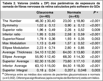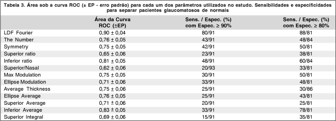 Além das análises descritas acima, também calculamos o poder diagnóstico de vários dos parâmetros de espessura da CFN fornecidos pelo software do GDx. Os parâmetros utilizados em nosso estudo foram: The Number, Symmetry, Superior Ratio, Inferior Ratio, Superior/Nasal, Max Modulation, Ellipse Modulation, Average Thickness, Ellipse Average, Superior Average, Inferior Average e Superior Integral. As definições destes parâmetros foram publicadas previamente(16). Curvas ROC foram obtidas para cada um dos parâmetros citados e valores de sensibilidade foram calculados para especificidades fixas.