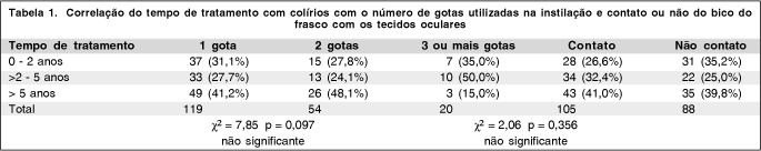 A tabela 1 correlaciona os diferentes períodos de tempo de tratamento com a medicação tópica em relação ao número de gotas utilizadas e o contato ou não da extremidade do frasco de colírio com os tecidos oculares. Ela permite observar que não houve significância estatística entre o tempo de tratamento e o número de gotas utilizadas (c2 = 7,85 p = 0,097), assim como entre o tempo de tratamento e o fato de fazer ou não contato do frasco de colírio com a superfície ocular (c2 = 2,06 p = 0,356).