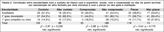 A tabela 2 correlaciona a escolaridade do grupo estudado com o contato do bico do frasco de colírio com a superfície ocular, com a compressão ou não do ponto lacrimal (ou a manutenção do olho fechado por dois minutos), e com o ato ou não de piscar após a instilação. Ela mostra que não houve correlação estatisticamente significante entre a escolaridade e o fato de fazer ou não contato do frasco de colírio com a superfície ocular (c2 = 2,97 p = 0,226), em realizar ou não a compressão do ponto lacrimal (c2 = 2,98 p = 0,225), e entre o piscar repetidamente ou não logo após ter instilado (c2 = 3,54 p = 0,170).