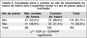 A tabela 4 correlaciona o contato ou não da extremidade do frasco de colírio com a superfície ocular e o ato de piscar repetidamente logo após a instilação, observando-se haver relação estatisticamente significativa entre eles (c2 = 4,04 p = 0,04454*).