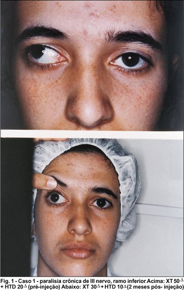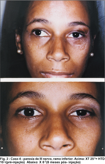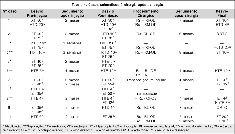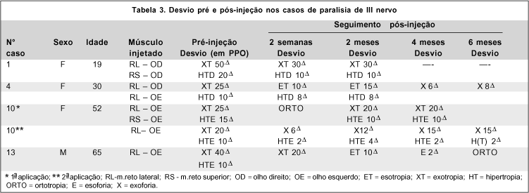 Os casos 1, 4, 10 e 13 apresentaram paralisia do III nervo com desvio pré injeção variando de XT 25D a XT 50D e HT (hipertropia) de 10D a HT 20D (média XT 35D e HT 13D ). Duas semanas após a aplicação, foi observada diminuição do desvio horizontal de aproximadamente 20D em todos os pacientes. Nos casos 4 e 10 houve resolução completa da exotropia, não havendo resposta em relação à hipertropia, no caso 4. Em 75% dos casos foi observada correção completa do desvio até o último seguimento realizado (Tabela 3).