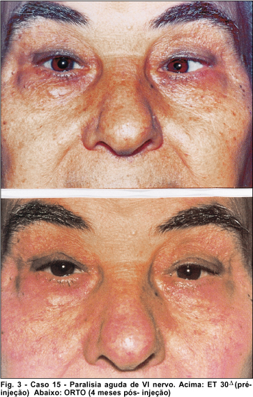 Dos 6 pacientes que apresentaram paralisias agudas, 5 (casos 6, 12, 13, 14, 15) apresentaram ortotropia (83%), avaliados 4 a 6 meses após aplicação. Um único paciente necessitou de duas aplicações e cirurgia (caso 5) (Tabela 5).