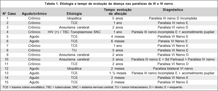 Onze pacientes (73%) apresentaram paralisia do VI nervo, sendo que um deles bilateral. Quatro pacientes (36%) apresentaram paralisia do III nervo incompleta, dois casos apresentando acometimento pupilar. Seis pacientes (40%) foram classificados como paralisias agudas (até 6 meses de evolução). Nove pacientes (60%), como paralisia crônica (mais de 6 meses de evolução).