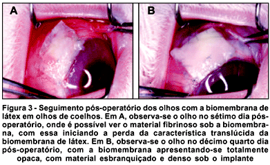 Em todos os olhos onde foram implantadas as biomembranas, elas permaneceram até o final do experimento, presas pelos pontos cirúrgicos, e não aderidas ao tecido subjacente. Uma fina camada de material fibrinoso recobria-as em ambas as faces (Figura 3). A epitelização ocorreu sob a biomembrana em todos os coelhos.
