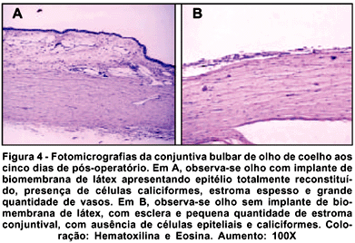 No presente estudo em coelhos, observou-se que a biomembrana de látex natural promoveu a reconstituição conjuntival, quando comparada ao grupo controle. De acordo com o descrito na literatura para outros tecidos, a biomembrana de látex natural também parece favorecer a cicatrização conjuntival e a neoangiogênese.