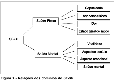 Os instrumentos de qualidade de vida têm adquirido reconhecimento como um importante instrumento para avaliar o impacto do tratamento na saúde e avaliar as percepções internas do ponto de vista do paciente. O SF-36 é um questionário genérico elaborado para avaliar a qualidade de vida, tendo sido validado no Brasil em 1997. Este instrumento mede dimensões relativas à saúde física e mental através de oito domínios: capacidade funcional, aspectos físicos, dor, estado geral de saúde, vitalidade, aspectos sociais, aspectos emocionais e saúde mental (Figura 1). Seus resultados são medidos em escores de 0 (pior condição de saúde) a 100 (melhor condição de saúde).