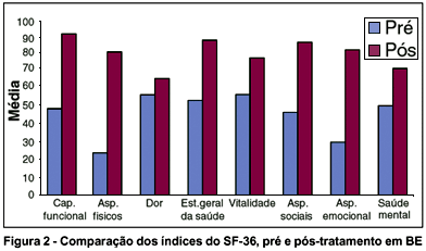 Para um nível de significância de 5%, apenas os domínios capacidade funcional e aspectos físicos do SF-36 e a EDB apresentaram diferenças estatisticamente significante entre os grupos BE e EH. Nos três casos, as maiores diferenças entre os valores pré e pós-tratamento foram encontradas nos casos de BE.