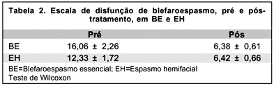Os resultados da escala da severidade da doença, antes e depois da aplicaç&qtilde;o da BTX-A, estão resumidas na tabela 2.