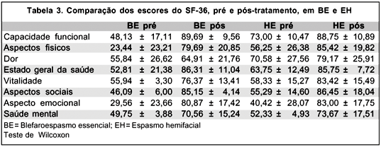 A média de índices para cada domínio de SF-36 no pré e pós-tratamento, em BE e EH, estão resumidos na tabela 3.
