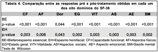 Sob tratamento efetivo com BTX-A, as mudanças nas taxas de saúde geral da população em estudo foram evidenciadas pelo aumento nos escores do SF-36, com diferença estatisticamente significante entre as respostas pré e pós-tratamento, para um nível de significância de 5%, para ambas as doenças. Os níveis descritivos para os domínios do SF-36 estão descritos na tabela 4.