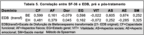 Após os cálculos das correlações entre EDB e SF-36 (pelo método de Spearman), mostraram relações significantes positivas, nos casos de BE, a capacidade funcional, o estado geral, o aspecto emocional e os aspectos sociais. Já com os pacientes de EH, nenhuma correlação foi significante (ver Tabela 5).