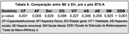 Através do teste de Mann-Whitney U, as diferenças entre o pré e o pós-tratamento obtidas nos domínios do questionário SF-36 e na EDB, entre os grupos BE e EH, estão descritos na tabela 6.