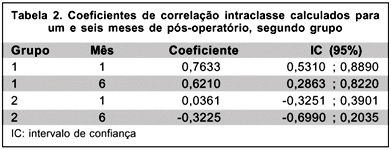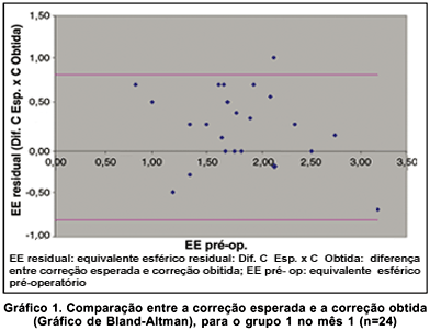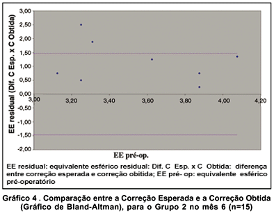 Ainda como parte da avaliação da eficácia do procedimento, comparamos os valores da correção esperada com os valores da correção obtida para cada grupo em um mês, e em seis meses de pós-operatório. Para análise da concordância dessas duas medidas de natureza numérica foram construídos gráficos de Bland-Altman (Gráficos 1, 2, 3 e 4) que mostram a diferença entre a correção esperada e a correção obtida (EE residual), segundo a média do EE pré-operatório, em um e seis meses de pós-operatório, para cada grupo. Foram calculados coeficientes de correlação intraclasse. (Tabela 2).