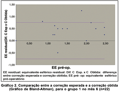 Na avaliação pós-operatória de seis meses, 50% dos olhos do grupo 1 apresentavam EE entre ±0,50 D, 77,3% entre ±1,00 D, 40,9% apresentavam (AV s/c) melhor ou igual a 20/20, e 95,5% melhor ou igual a 20/40. No grupo 2, dos olhos avaliados após seis meses de cirurgia, 26,7% apresentavam EE entre ±0,50 D, 53,3% entre ±1,00 D, 46,7% apresentavam AV s/c melhor ou igual a 20/20, e 93,3% melhor ou igual a 20/40.