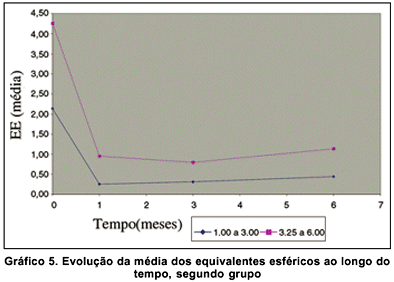 Quanto à estabilidade, embora possamos observar discreto aumento do EE médio ao longo do tempo, especialmente no grupo 2 (Gráfico 5), não houve diferença estatisticamente significante entre um e três, três e seis, e um e seis meses, em nenhum dos grupos. Entretanto, em virtude do curto tempo de seguimento (seis meses) não julgamos estes resultados suficientes para atestar a estabilidade do procedimento. Estudo prospectivo com o sistema Ladar Vision de excimer laser, com tempo de seguimento de 1 ano demonstraram a estabilidade do lasik hipermetrópico(7).