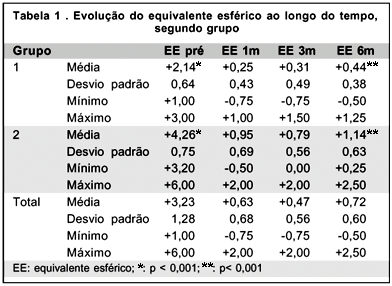 No grupo 1, dos olhos avaliados no primeiro mês de pós-operatório, 75% estavam com EE entre ±0,50 D e 87,5% entre ±1,00 D. No grupo 2, neste mesmo período, 44,8% dos olhos estavam com EE entre ±0,50 D e 65,5% entre ±1,00 D. Ainda no primeiro mês de pós-operatório, 62,5% dos olhos no grupo 1 apresentavam AV sem correção (AV s/c) igual, ou melhor, que 20/20, e 100% apresentavam (AV s/c) igual, ou melhor, que 20/40. No grupo 2, 34,5% apresentavam (AV s/c) igual, ou melhor, que 20/20, e 86,2% apresentavam (AV s/c) igual, ou melhor, que 20/40.